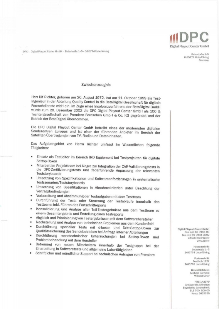 STARTSEITE BEWERBUNG ÜBER MICH LEBENSLAUF AUSBILDUNG WEITERQUALIFIZIERUNG ARBEITSZEUGNISSE 2010 - TESC - Seite 1 2010 - TESC - Seite 2 2007 - TESC - Seite 1 2007 - TESC - Seite 2 2003 - DPC - Seite 1 2003 - DPC - Seite 2 2002 - Beta Digital - Seite 1 2002 - Beta Digital - Seite 2 1999 - PREMIERE 1998 - NDR - Seite 1 1998 - NDR - Seite 2 1994 - HEVAG DOWNLOAD